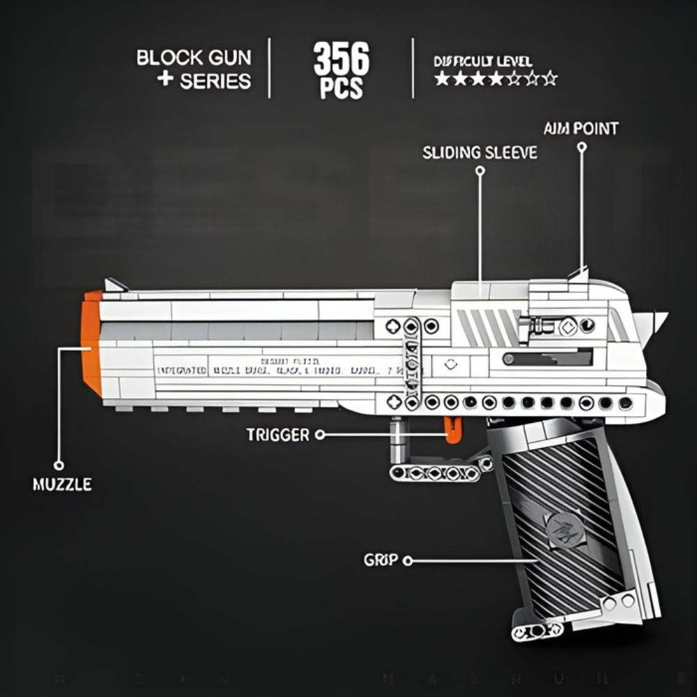 Our brick Desert Eagle contains 408 pieces, ammunition and detailed step-by-step instructions!