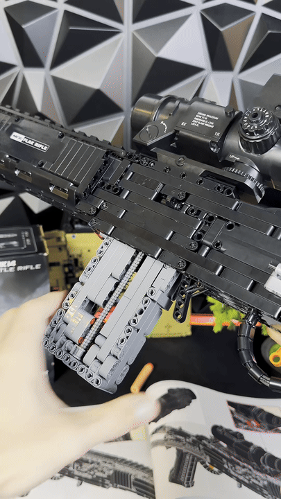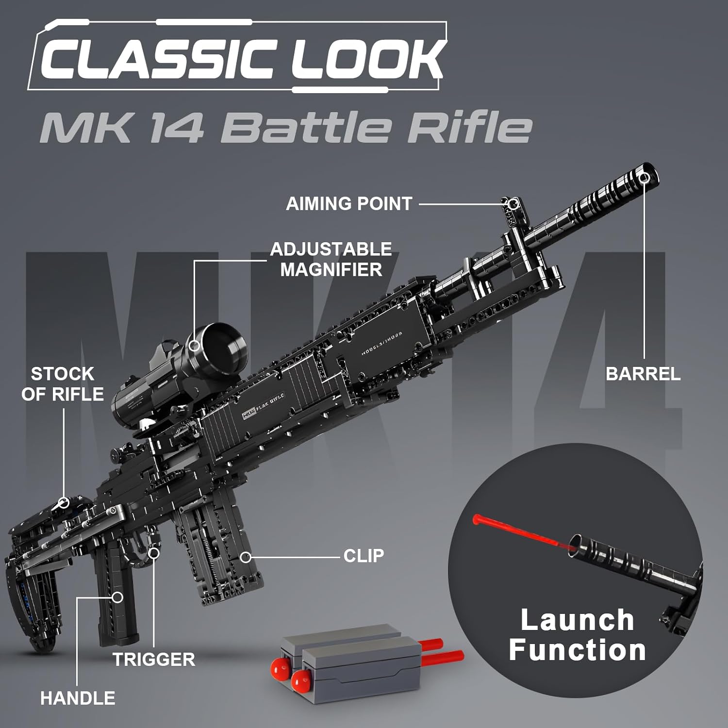 Our brick MK-14 includes 1606 pieces, ammunition, detailed step-by-step instructions and a working scope!